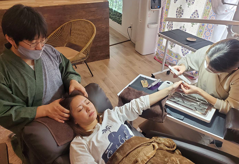 OhaiAliiでは「ネイル」、「アイラッシュ」、「美容鍼」、「リラクゼーション」、「脱毛」、「エステ」を行っております。当施設の強みは同時施術(※)ができるため、普段お忙しい方でもご来店がしやすいところです。